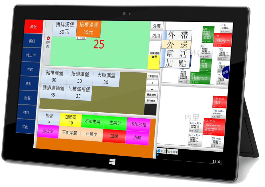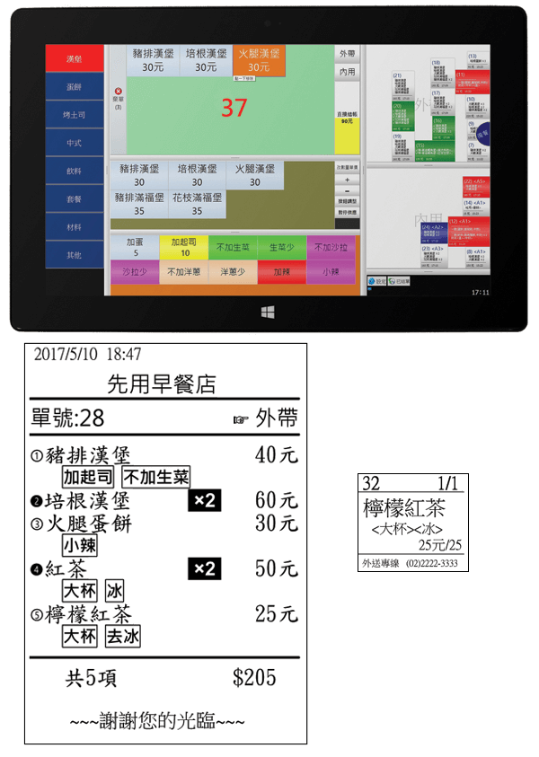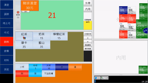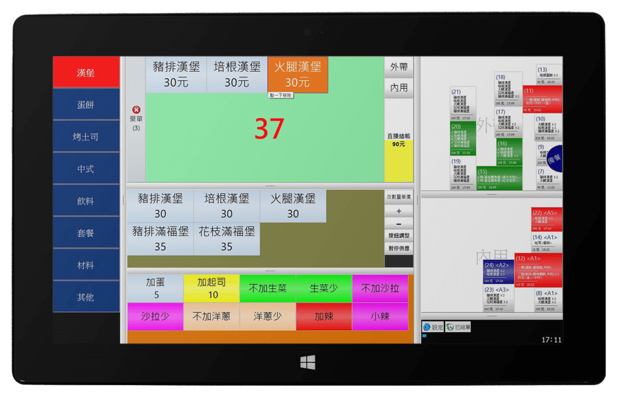 先用POS的點餐設計是非常直覺的,不管是餐點的口味註記,特殊口味註記,加價客製,套餐折扣,飲料多選一,系統都能夠自動跳出引導選項,店員只要依據畫面詢問客人喜好,就能快速完成點餐。 除了點餐外,系統的主畫面也能同時顯示未結單據,無須切換,結帳、加點、拆單、併單全只需要一次點擊,這是首創,且無人能及。